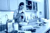 culinary, baking and people concept - happy smiling young woman cooking food on kitchen at home and using immersion blender
