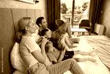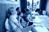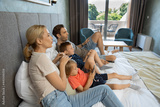 Happy family sitting on a hotel bed and watching TV