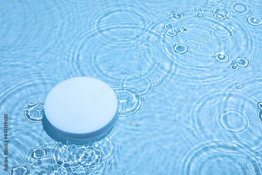 Empty white circle podium on transparent clear calm blue water texture with splashes and waves in sunlight. Abstract nature background for product presentation. Flat lay cosmetic mockup, copy space.