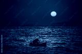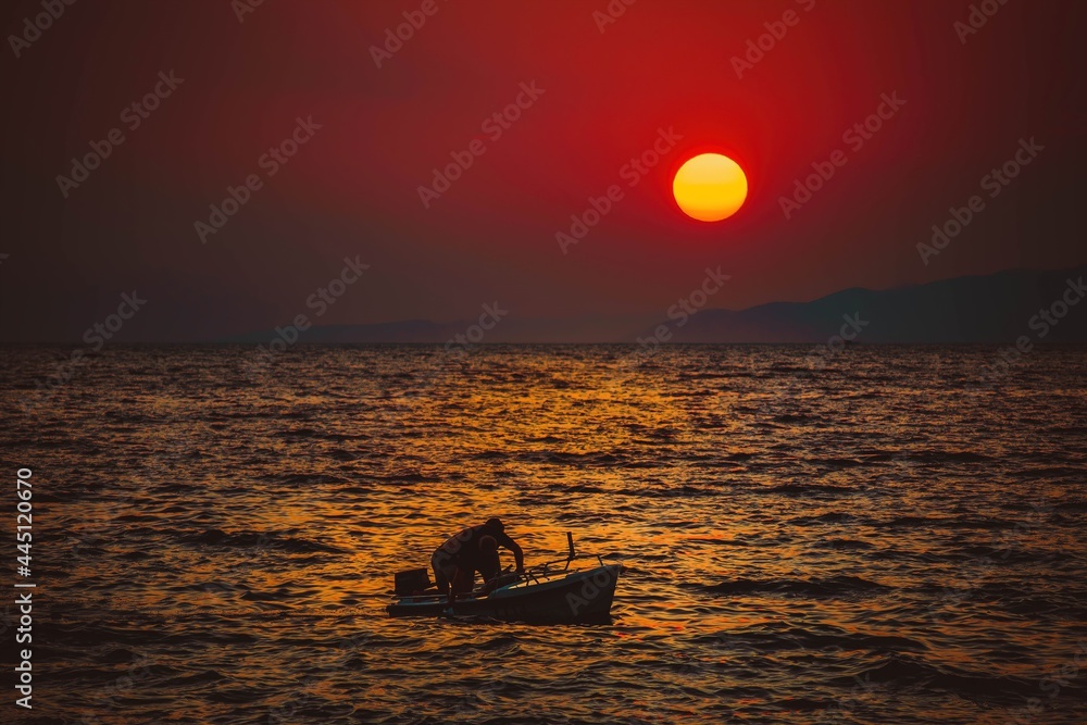 Pływający ludzie na morzu na tle ogromnego zachodzącego słońca