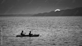 Pływający ludzie na morzu na tle ogromnego zachodzącego słońca