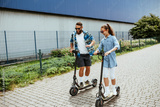 Dad and daughter rides scooters, electric transport. The best dad in the world.