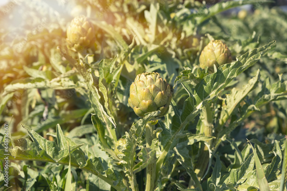 A close up view of ripe Artichoke (Cynara cardunculus ) in a field of Artichokes. Spring time