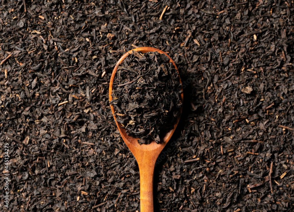 Background with tea leaves and a wooden spoon for the entire screen.