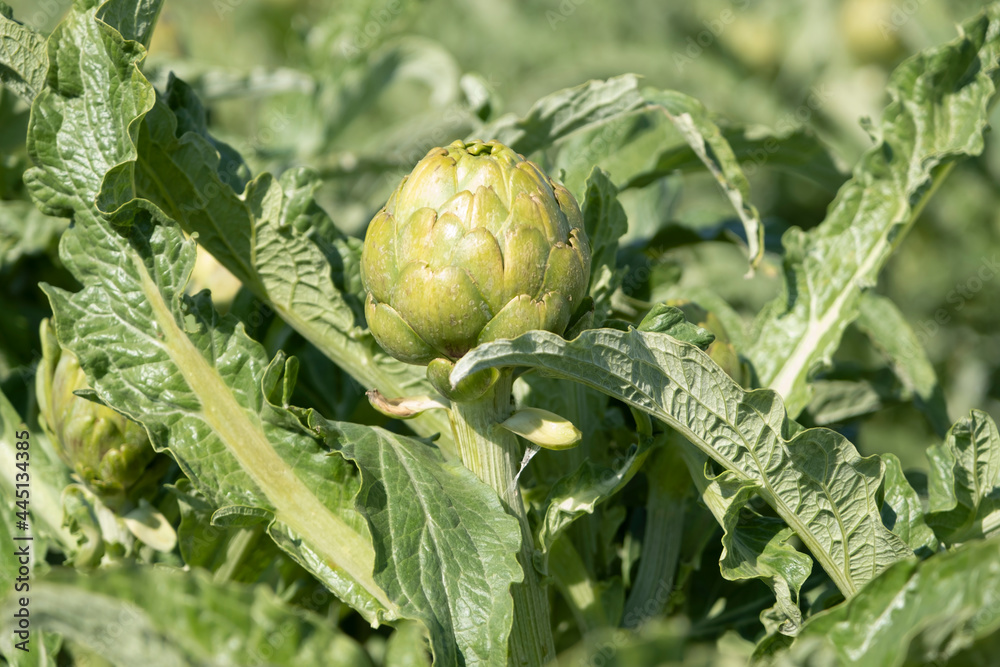 A close up view of ripe Artichoke (Cynara cardunculus ) in a field of Artichokes. Spring time