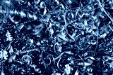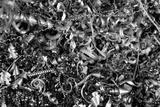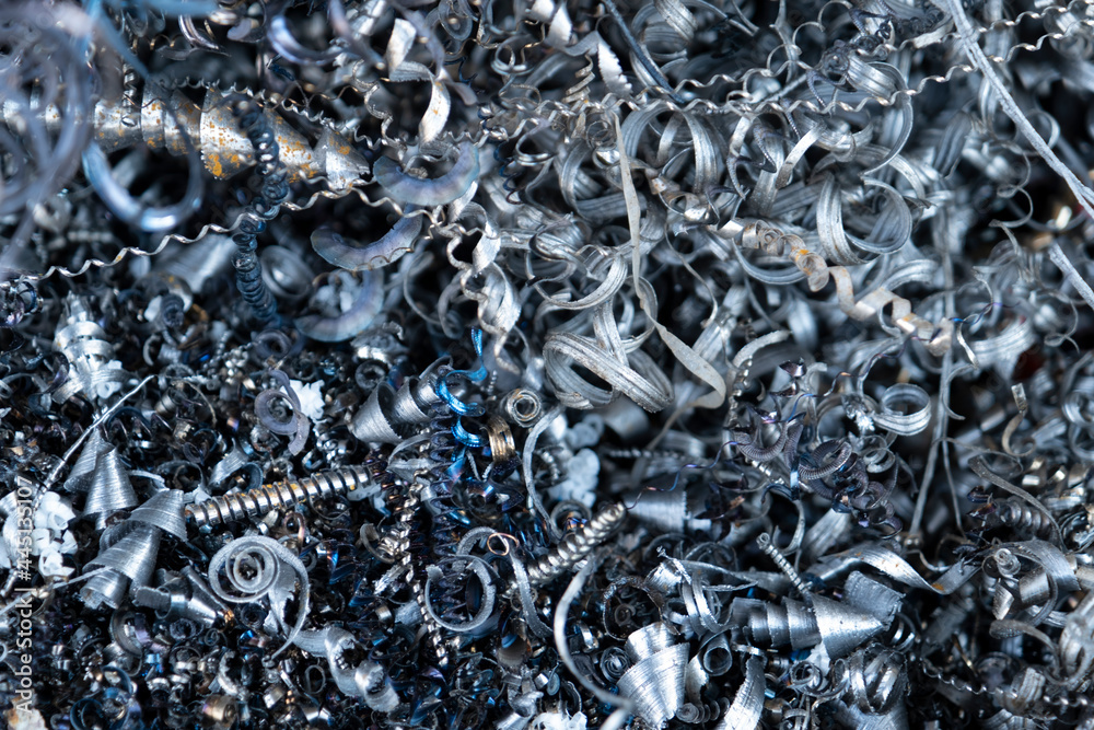 Steel scrap materials recycling. Aluminum, iron chip waste after machining metal parts on a cnc lathe. Closeup abstract twisted spiral steel shavings. Small roughness sharpness, blurred focus