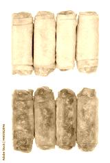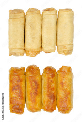 Spring rolls, from above, isolated on white background. Two rows, each of four spring rolls, unfried and crispy fried in a pan. Filled, rolled wrappers. Asian cuisine appetizers. Close-up, food photo.