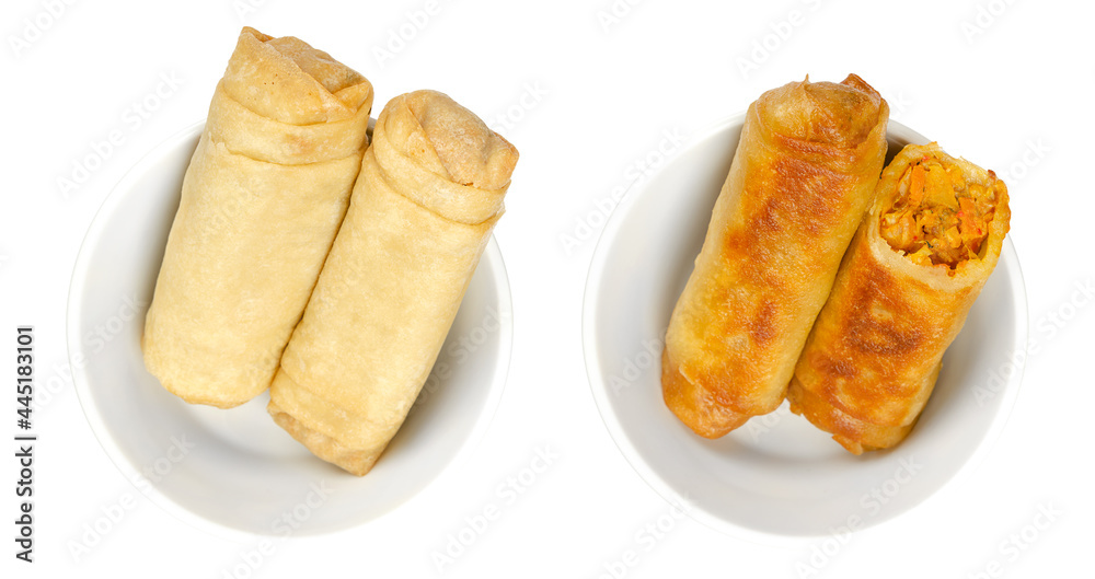 Spring rolls in white bowls. Unfried and in a pan crispy fried spring rolls. Vegetable filled and rolled wrappers, Asian cuisine appetizers. Close-up from above, isolated over white, macro food photo.