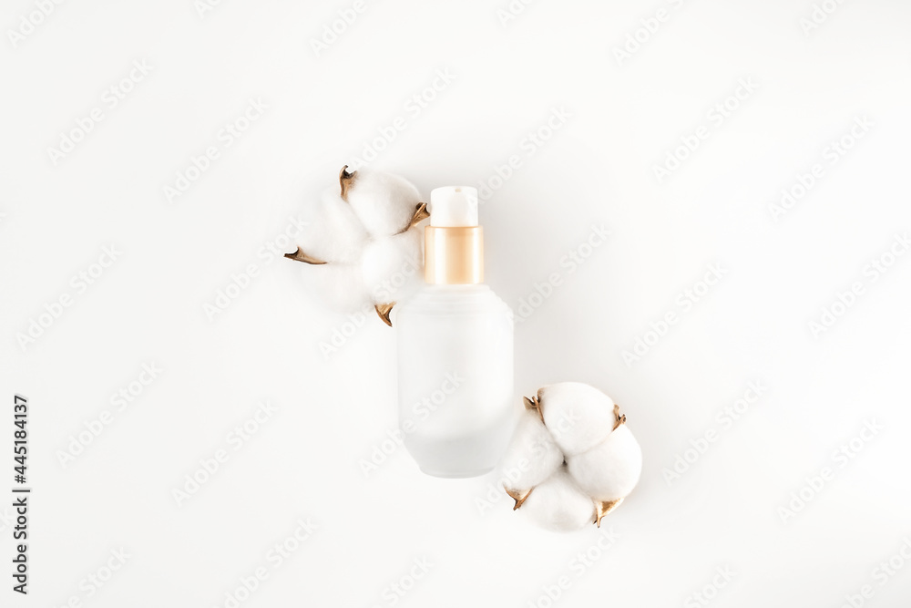 Beautiful spa composition of natural cosmetics mockup bottle with cotton flowers on white background. Top view. Flat lay style. Copy space.
