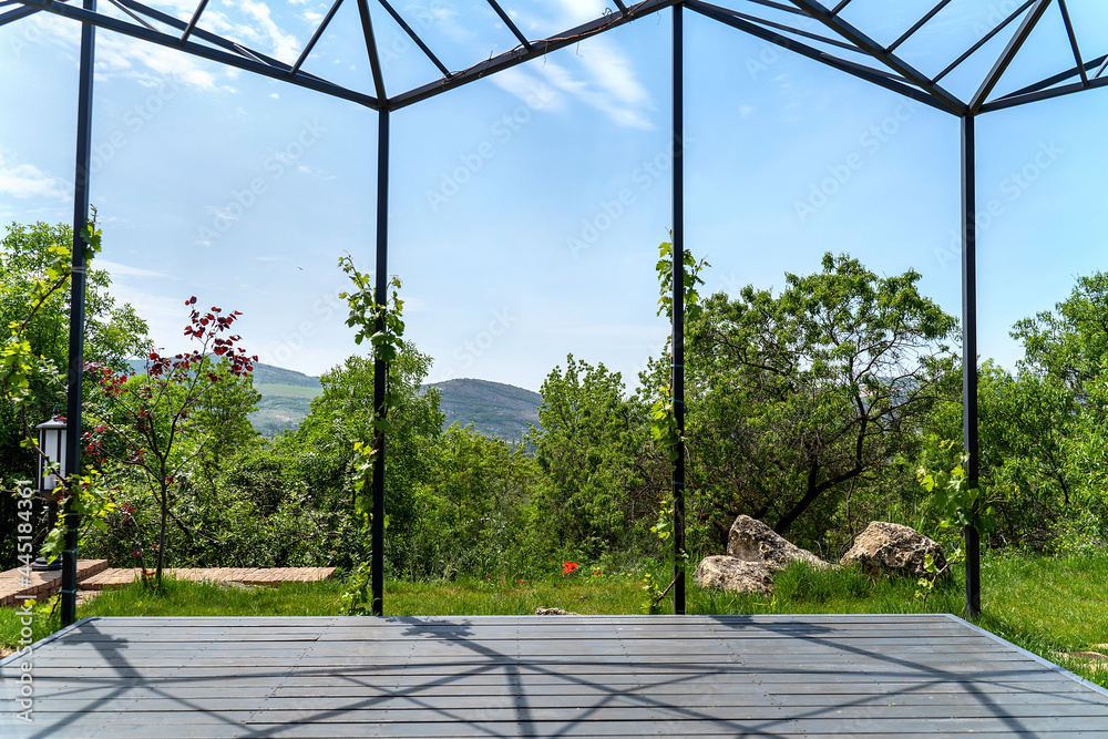 Beautiful veranda with climbing vine and mountain view on a beautiful spring sunny day. Nature background. Travel concept.