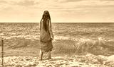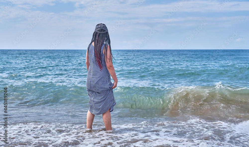 A young woman with dreadlocks on black hair, in baseball cap and long striped dress walking into the water.