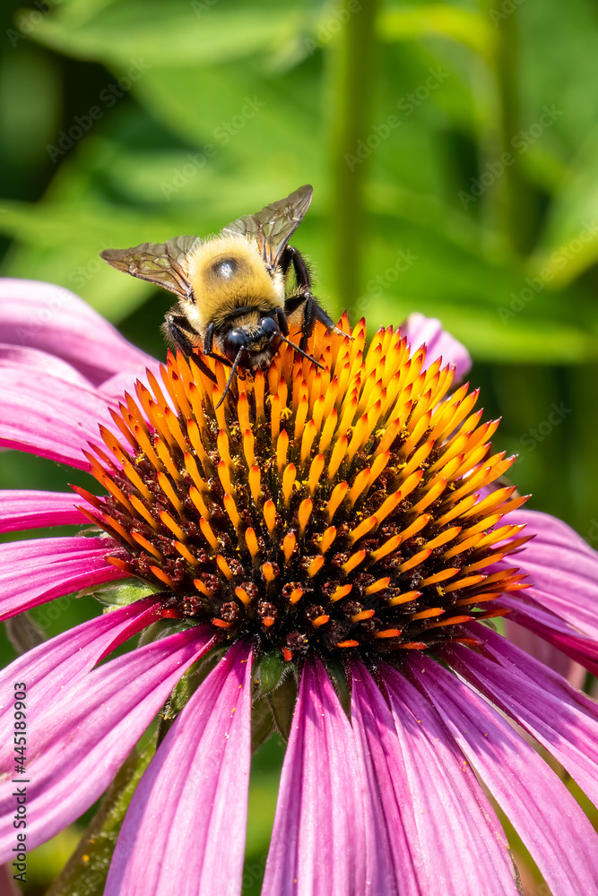 macro view of a fuzzy bee on a purple coneflower