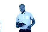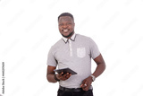 young man holding digital tablet smiling.