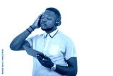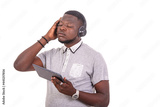 young man listening to music with headphones on a digital tablet.