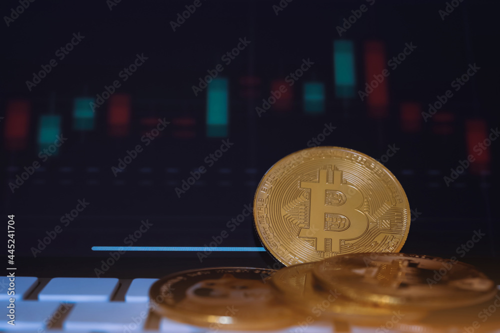 Gold Bitcoin with blurry stock graph background, Bitcoin Cryptocurrency Coins on Keyboard, Digital money, Investing with Digital Assets, Saving, Future finance, Blockchain and stock Market business