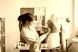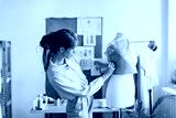 Lady in beige outfit designes clothes patterns. Brunette woman in light shirt creates stylish fashionable top on mannequin