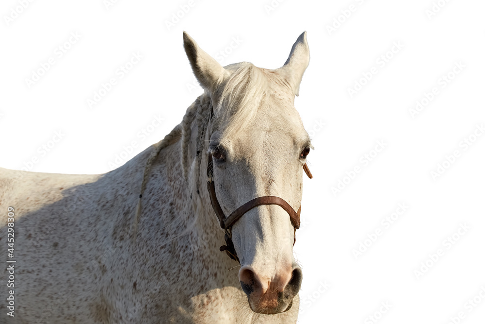 Portrait of an arabian horse of gray color on a white background
