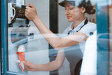 A female seller holds a cone with a twisted ice cream from a vending machine in her hand. Small business and takeaway food, summer food, cool off in the heat
