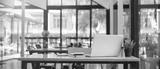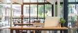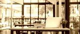 Close up view of co-working space table at cafe with laptop and blurry cafe interior in the background