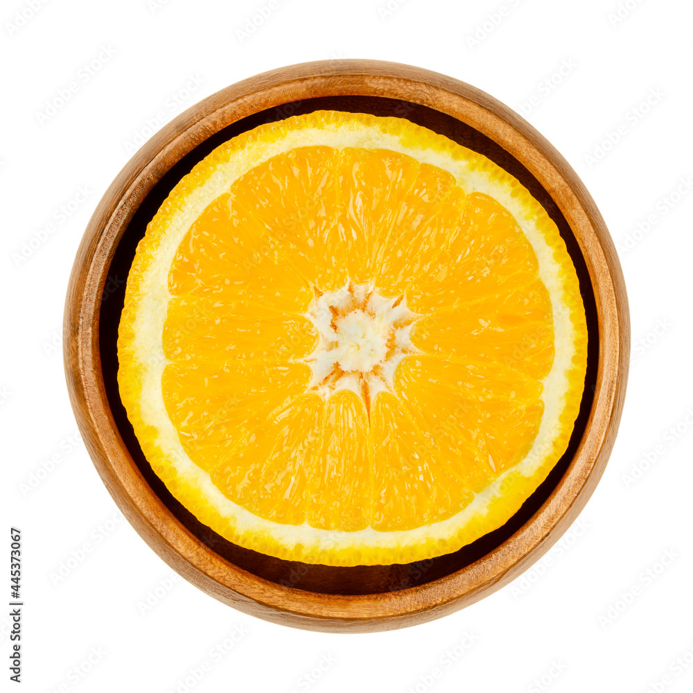 Orange half, in a wooden bowl. Cross section of a Valencia orange. Ripe and sweet fruit with yellow, and juicy fruit flesh, and thick skin. Close-up, from above, isolated over white, macro food photo.