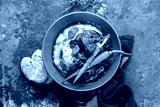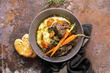 Beef bourguignon served in a rustic manner with smashed potatoes