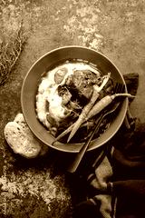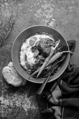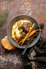 Beef bourguignon served in a rustic manner with smashed potatoes