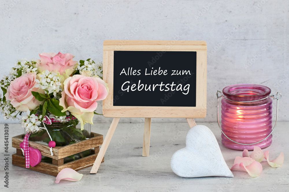 Geburtstagskarte: Tafel mit dem Schriftzug Alles Liebe zum Geburtstag mit Rosenstrauß.