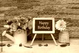 Blackboard with the text Happy Birthday and a bouquet of flowers