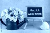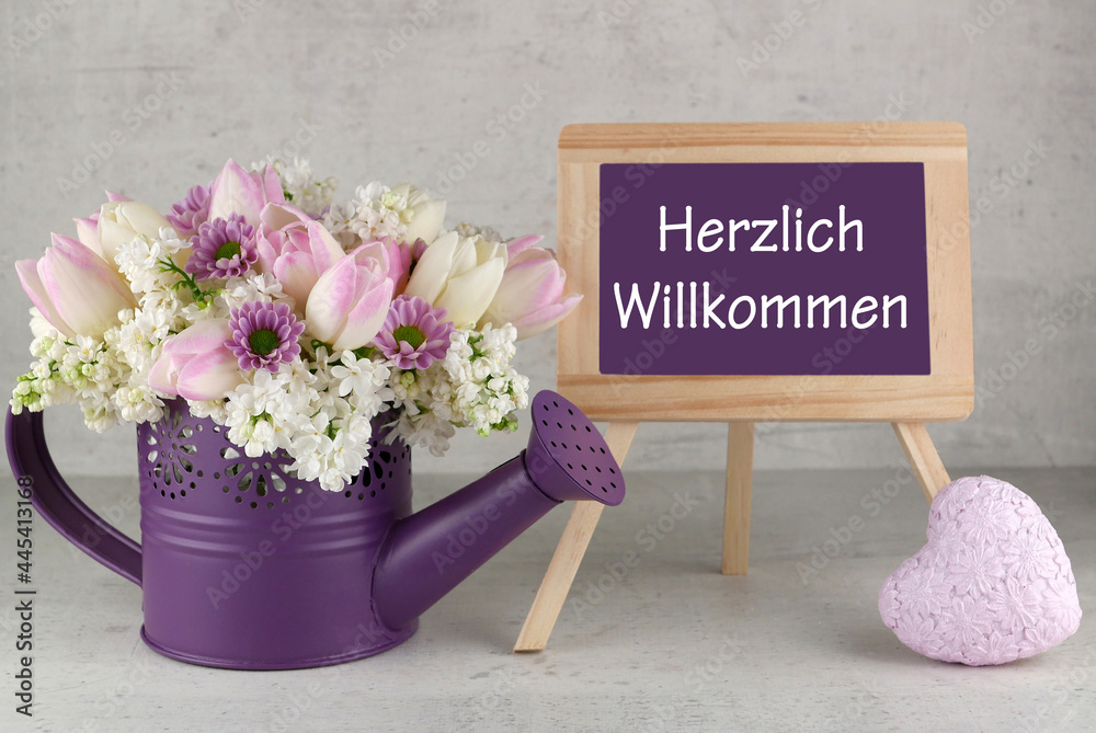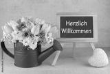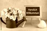 Blumenstrauß und eine Tafel mit dem Text Herzlich Willkommen.
