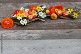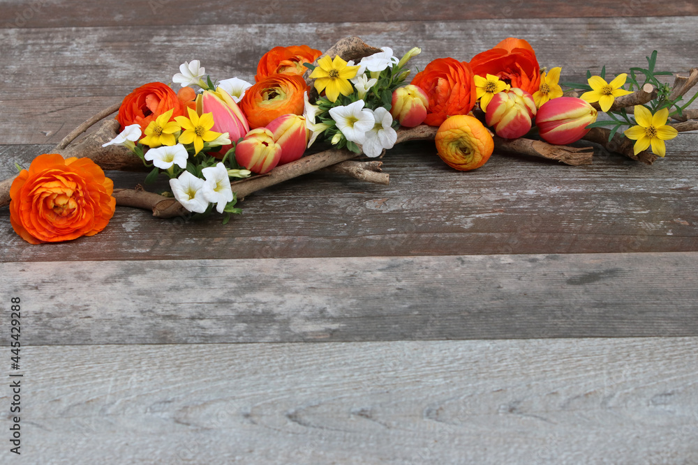 Blumenarrangement aus Tulpen und Ranunkeln auf einem alten Holzboden