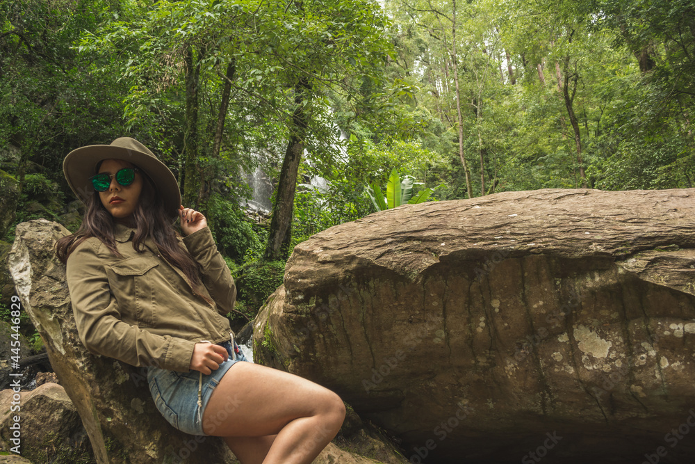 Adventurous girl exploring waterfalls in the middle of the jungle, with light clothes finds amazing landscapes. She wears a green windbreaker and blue denim shorts.