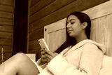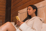 Latin girl relaxing on her vacation in a cabin while looking at her smartphone, resting quietly on the bed with her bathrobe.