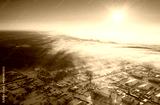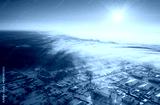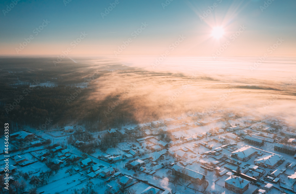 Aerial View Top Elavated View Winter Snowy Forest Landscape. Steam Light Clouds Flowing On Air. Sunny Winter Frozen Day. Misty Morning Sunrise