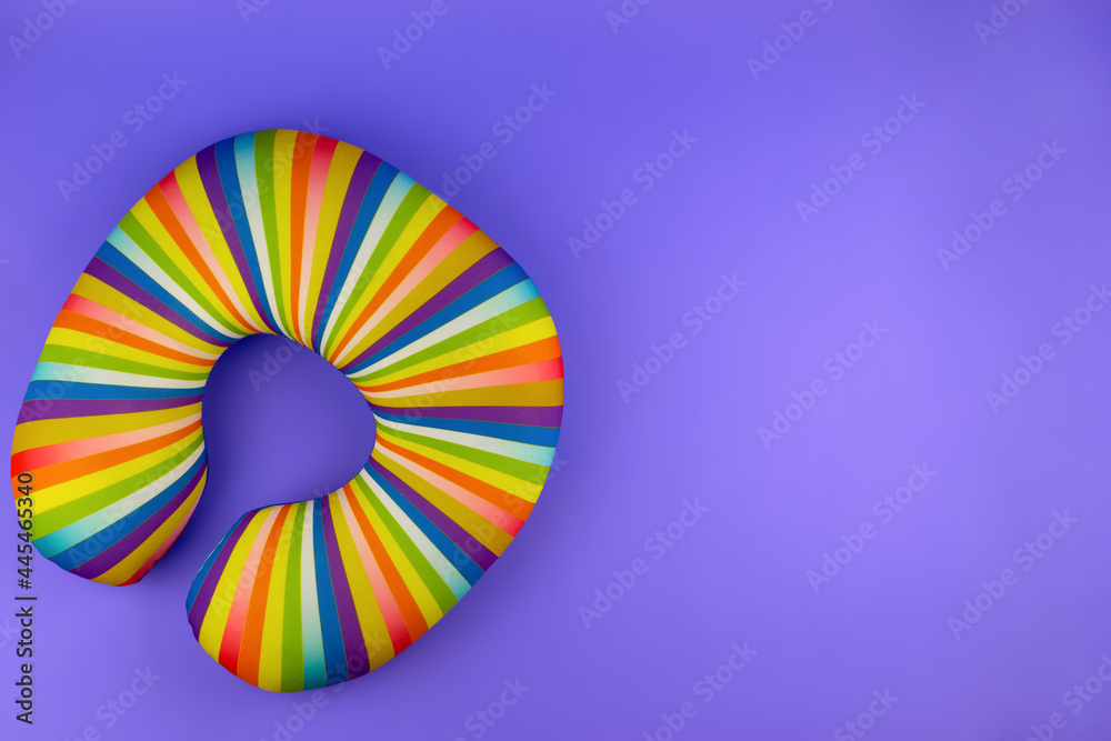 Travel neck pillow on a purple background. Memory foam neck pillow, top view.