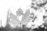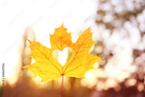 yellow leaf with a heart in a female hand, background of golden leaves lie chaotically on the ground, autumn mood concept, seasonal