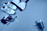 Women's sportswear and training equipment. Fitness accessories on a purple background, top view. Concept of fitness and a healthy lifestyle. Sports shoes, vitamins, a water bottle.