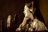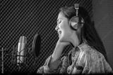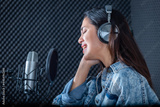 Happy cheerful pretty smiling of portrait of young Asian woman vocalist Wearing Headphones recording a song front of microphone in a professional studio