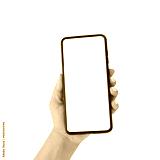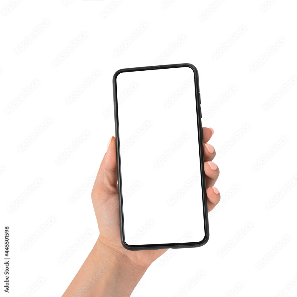 close up hand hold phone isolated on white. Hand hold mockup cell smart phone with blank white screen. woman hand hold using cellphone. square image