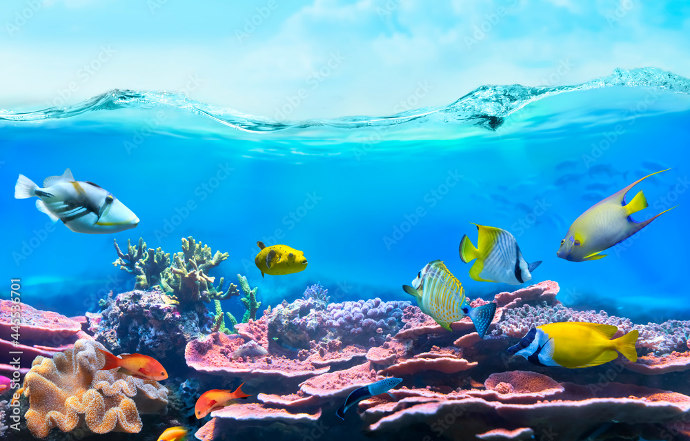 Colorful tropical fish in shallow coastal waters. Life in a coral reef - rabbitfish. Animals of the underwater sea world. Ecosystem.