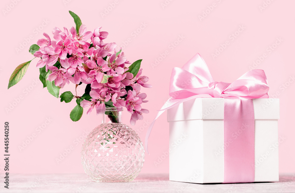 Pink pastel holiday. gift box and spring or summer flowers branch in a crystal ball vase. Monochrome., birthday or wedding. Valentines or Mothers day