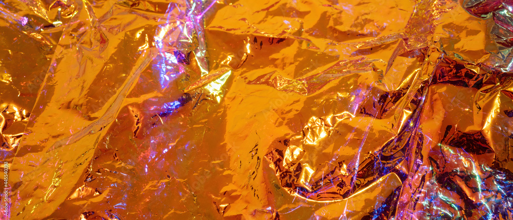 Holographic background. Real texture of iridescent film in bright orange colors.