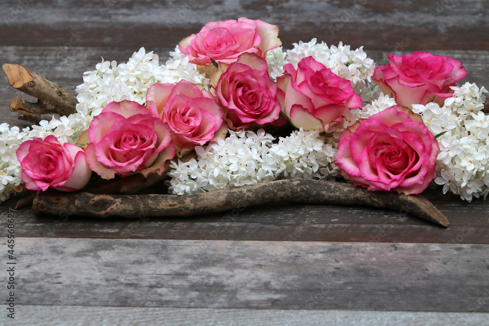 Blumenarrangement mit Rosen und Flieder