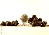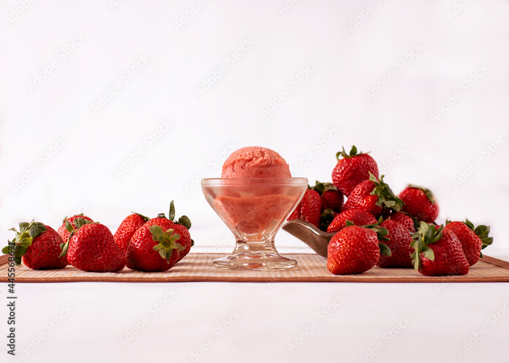 Strawberry ice cream in a glass with ingredients used to decorate the background