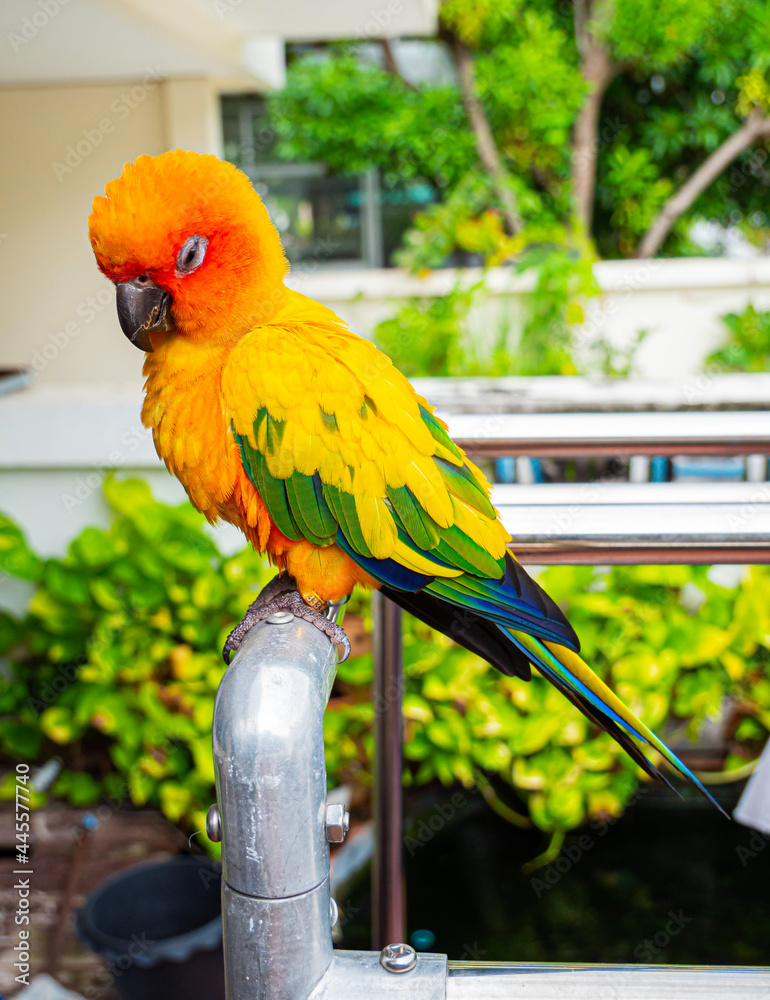 Parrots, Sun Cornure, yellow and green. Parrots are raised independently. Can fly as needed. cute bird or pet naturally reared Not caged or chained, able to fly freely.