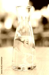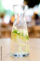 Water with lemon and cucumber in a glass bottle. Sassy water for detox or diet on a wooden table. Healthy food, weight loss, lifestyle concept. Close-up. Side view, vertical orientation