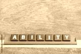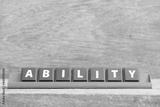 Tile alphabet letter with word ability in red color rack on wood background