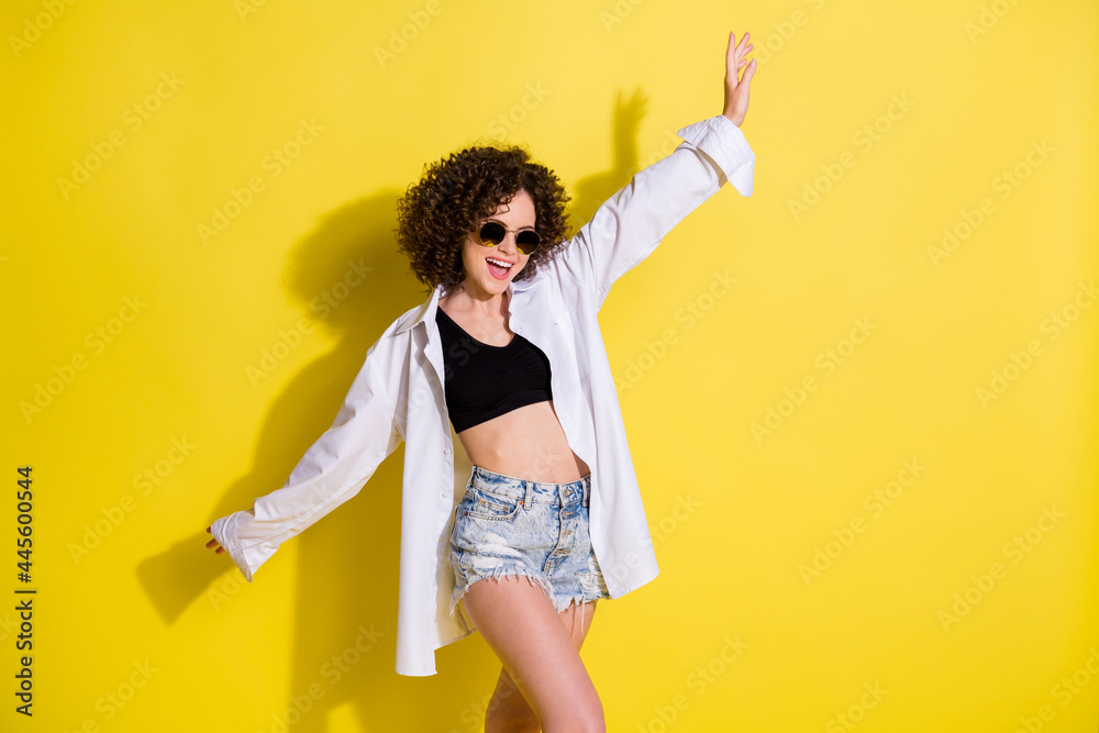 Photo of sweet shiny young woman dressed black top dark eyewear dancing smiling isolated yellow color background