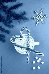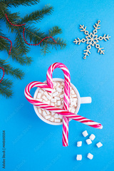 Christmas composition with heart-shaped caramel sticks and hot chocolate with marshmallows on the blue background. Top view.