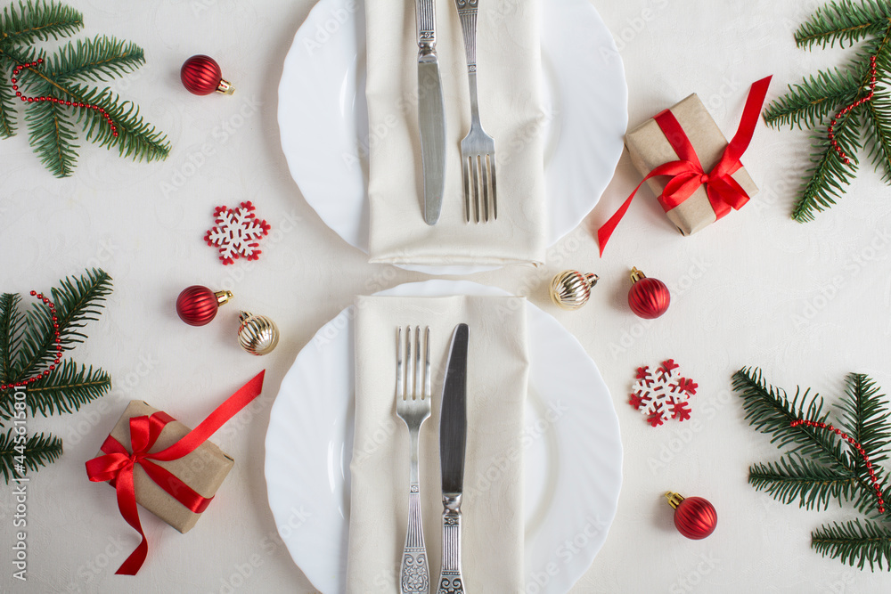 Christmas table setting on the beige tablecloth. Top view. Close-up.
