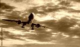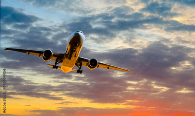 Plane goes on takeoff at sunset on cloudy sky background